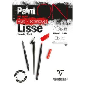 Avant de ma lancer sur ce nouveau dessin, j’ai réfléchi à l’évolution vers laquelle je voulais tendre : éliminer, dans la mesure du possible, la visibilité du trait. Et, pour commencer à travailler dans cette direction, j’ai d’abord décidé de changer de support. J’ai mis de côté mon papier pour aquarelle, et je suis parti explorer les rayonnages de ma boutique préférée, jusqu’à arrêter mon choix sur une référence « Paint ON » de chez Clairefontaine, support multi-techniques lisse, en format A3, et grammage 250 g/m².